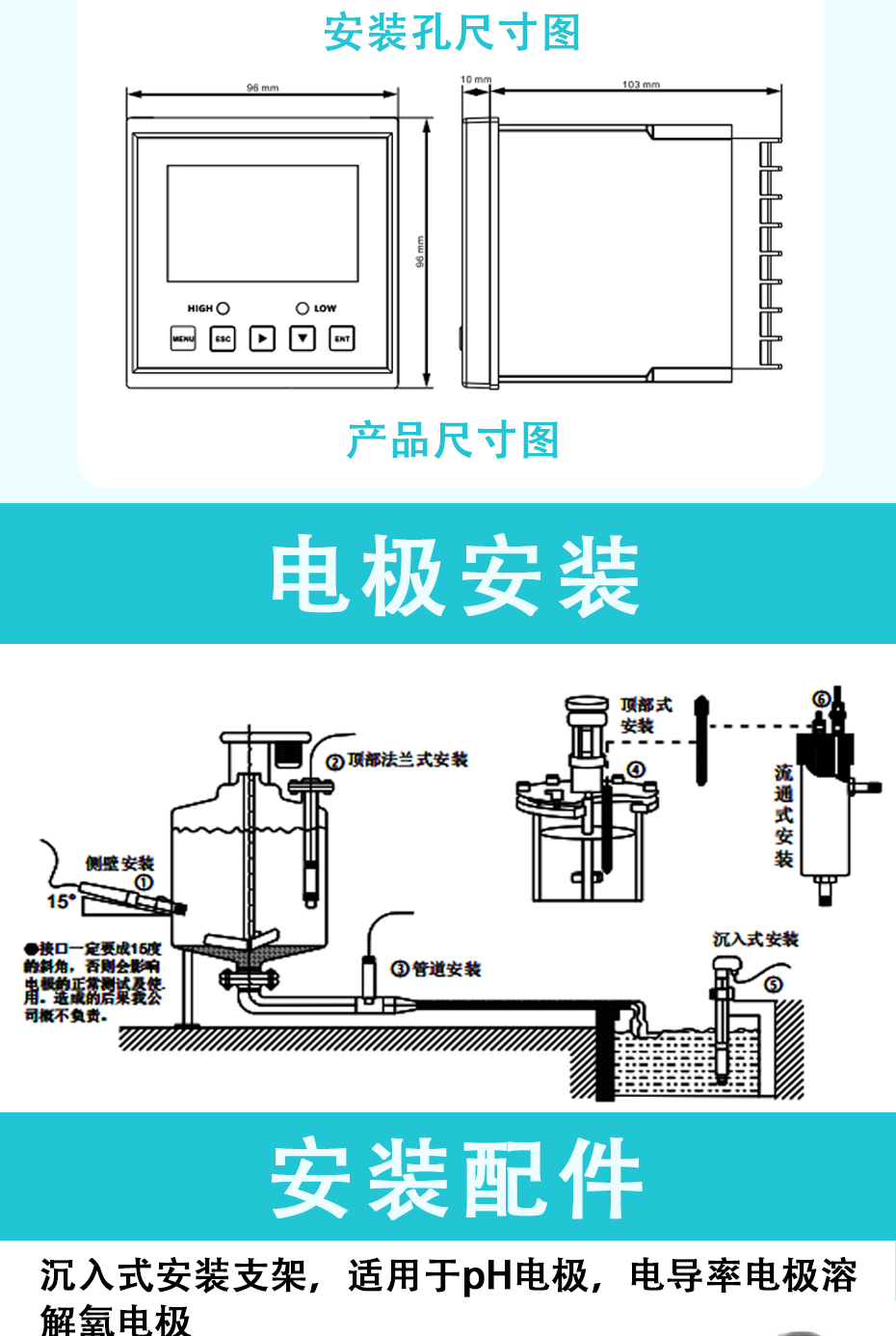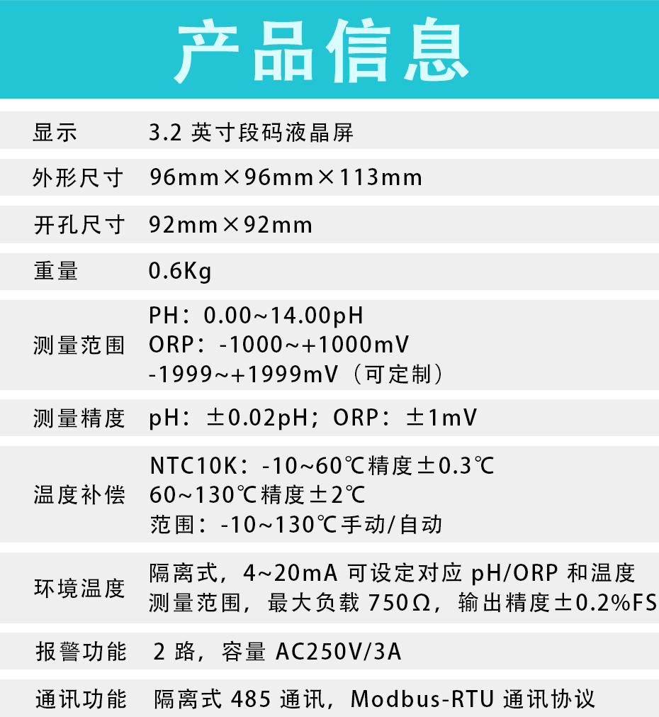 適用場合:PH/ORP測試儀是一款智能在線化學分析儀器之一,是一款廣泛應用于火電、化工化肥、冶金、環保、制藥、生化、食品和自來水等溶液中PH值或ORP值和溫度的連續監測。 連續監測數據通過變送輸出連接記錄儀實現遠傳監控與記錄,也可以連接RS485接口通過MODBUS-RTU協議可方便聯入計算機實現監控與記錄。